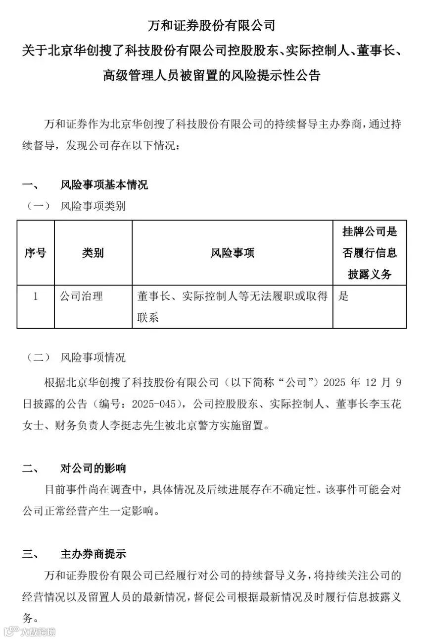 12 月 11 日,一则监管公告打破了平静:北京华创搜了科技发布风险提示,公司董事长、实际控制人李玉花,连同财务负责人、法人代表李挺志,已被北京警方实施留置,目前无法正常履职、联系不上。