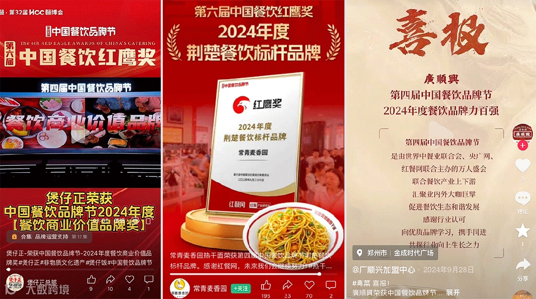 值得关注的是,“中国餐饮红鹰奖”的行业影响力正转化为品牌的自发传播动能—— 众多获奖品牌通过视频号、微信公众号、微博、抖音等多平台,以专题报道、短视频、图文贺报等形式分享获奖喜讯。