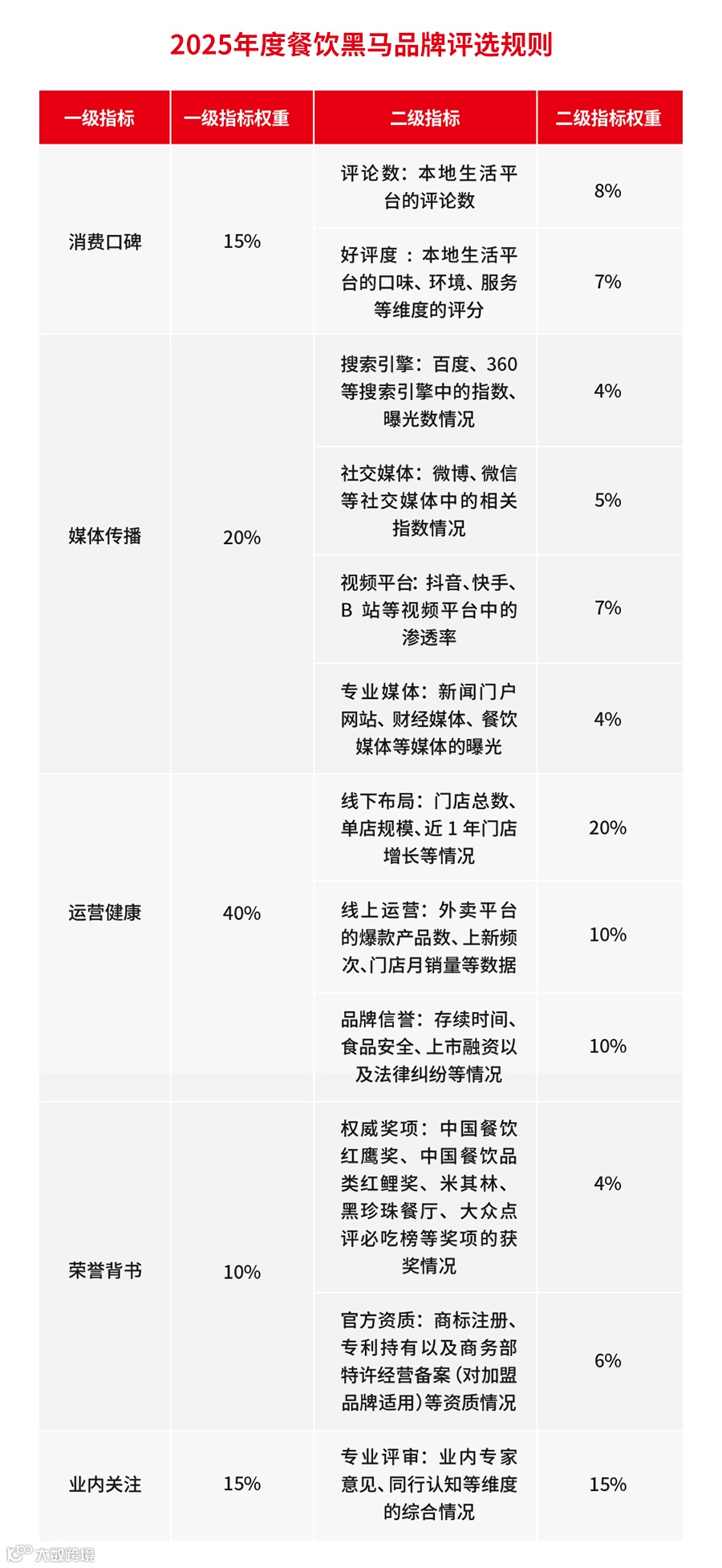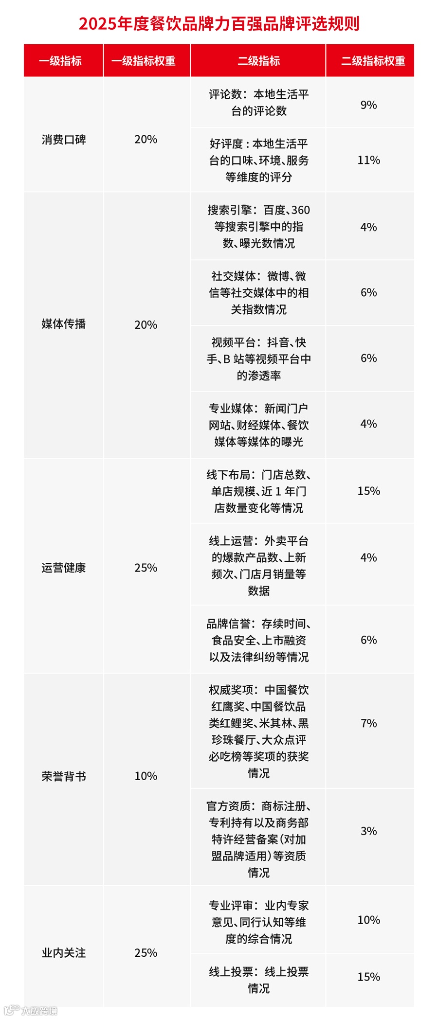 2025年度的“餐饮品牌力百强”“餐饮区域标杆品牌”以及“餐饮商业价值品牌”四大奖项均遵循同一个评选体系,以红餐大数据为基础,结合红餐指数,依据消费口碑、媒体传播、运营健康、荣誉背书、业内关注这五大一级指标以及细化的13个二级指标的综合表现进行评定。通过科学合理地设置各指标权重,确保评选的全面性、专业性与权威性。