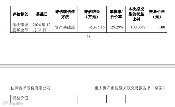 据天健兴业出具的《评估报告》,佳沃臻诚100%股权评估值仅为-5475.16万元。基于该评估值,对于佳沃臻诚100%股权,交易双方确定的交易对价仅为1元人民币,这样的低价甩卖也实属罕见。