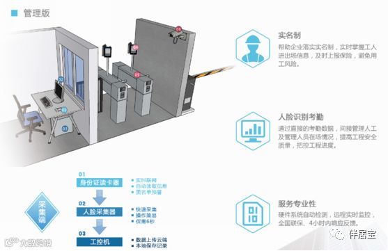 对工程建设项目施工现场劳务作业人员实行有效身份实名管理 ,集成和利用门禁技术、通道闸管理技术、视频监控技术、实名显示技术、劳务考评、劳务通道流量统计等科技手段运用到建筑领域,服务于建筑行业。