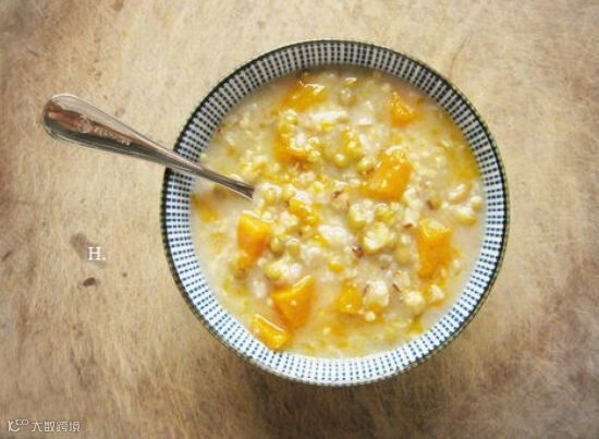 南瓜、马蹄、小米洗干净,放入锅内小火煮20分钟的绿豆百合里,开大火,煮开后小火熬;