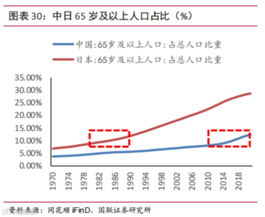 2000年,中国65岁以上人口占比从6.81%增长到2021年的12.41%;日本的老龄化人口呈现出类似的增长步伐,已经从1970年的6.88%增长到1991年的12.31%。