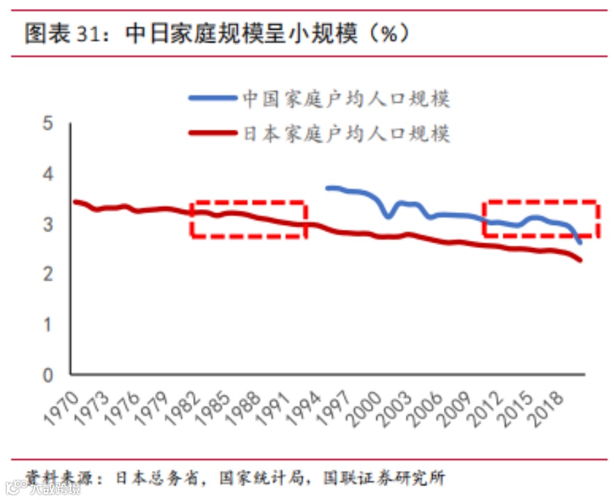 两个国家家庭规模都走向小型化趋势。像是日本平均每户规模从1970年的3.4人/户,下降到1990年的2.99人/户。中国的家庭规模也从2000年的3.44人/户,下降到2000年的2.62人/户。