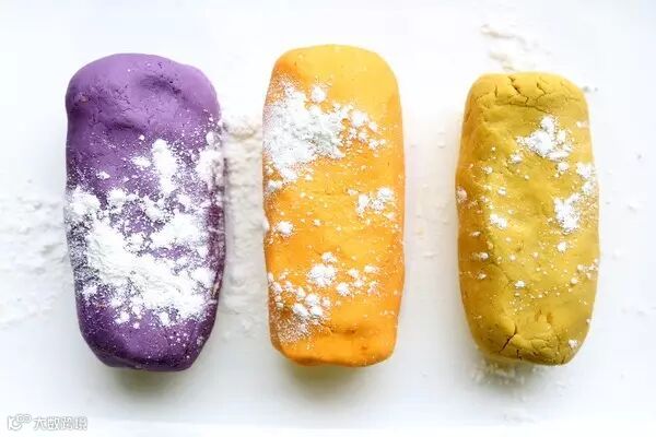 小编搭配如图:紫薯配天兴黑芝麻粉,西瓜薯配咸蛋黄、蛋黄薯配白芝麻。