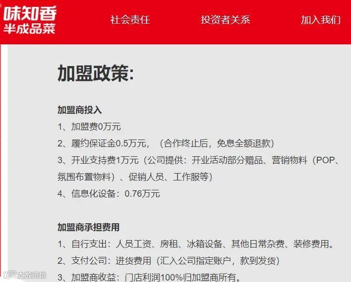 而从店型来看,味知香加盟店的定位更像是夫妻店,比较适合预算较低的创业者。味知香官网发布的加盟条件显示,开一家味知香加盟店无需加盟费,只需要履约保证金5000元、开业支持费10000元、信息化设备0.76万元,装修费用、冰箱设备、房租、人员工资等则由加盟商自行支付。