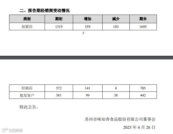 △图片来源:味知香2023年第一季度主要经营数据公告