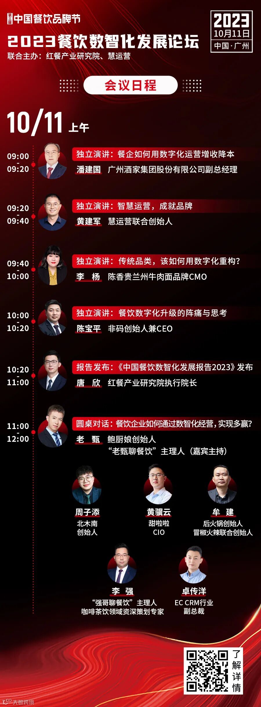 其中,由红餐产业研究院和慧运营联合主办的“2023餐饮数智化发展论坛”将于10月11日上午举办。届时,多位重磅嘉宾共同探讨餐饮行业数智化解决方案,助力餐饮产业数智化升级。