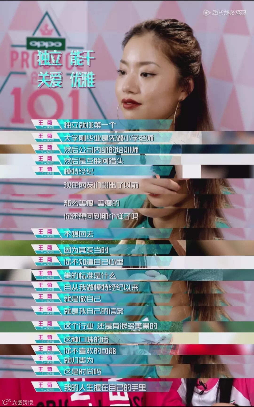 我是跳着看节目的,刚开始觉得王菊挺好玩。她长得一般,行事风格怪异,甚至她的粉丝团体,跟别人的都很不一样。后来觉得她这个人没什么意思,是她的那些口号和歌词:重新定义中国女团的权利在你们手里、IACE GILRS不为相夫教子···搞得好像很“女权”,其实我们身边大部分女生也都能说得出来,但没有人天天这么喊。就,挺傻的。