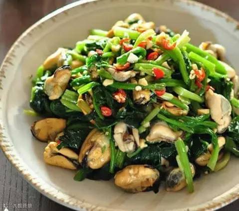 重新起锅,锅里倒油,放入花椒粒,小火炸出香味后将花椒粒捞出,再将锅里的油加热至7成热,在将热油淋入装有菠菜和海虹的容器中,拌匀就可以啦。(海虹可以换其它贝类)
