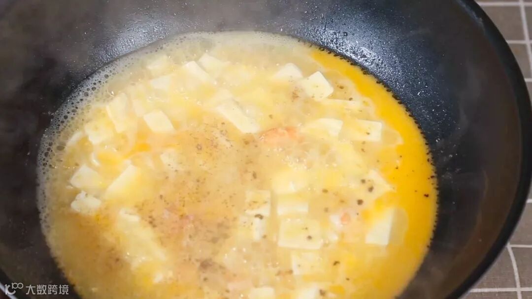 5,放入豆腐块煮几秒钟,再加入虾仁煮开。