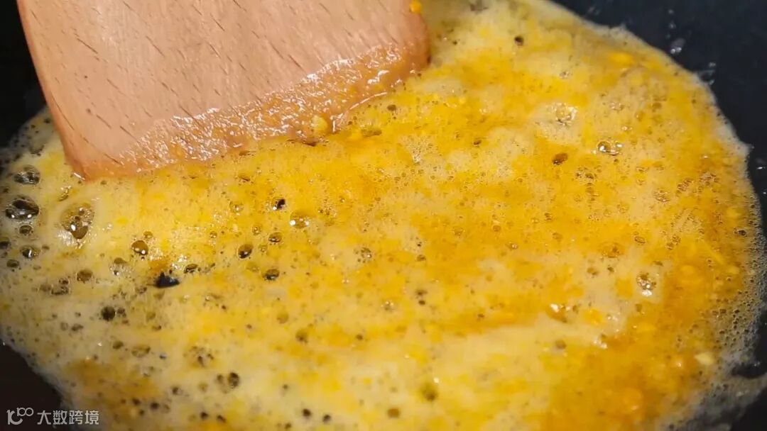 4,热锅注入油,将蛋黄倒入翻炒,加入一碗开水熬半分钟。