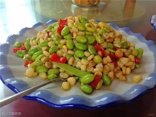 新鲜剥下来的甜脆包谷粒,和现剥毛豆或豌豆、青豆粒,其中任选一样,炒在一起,就是云南著名的两亩地。