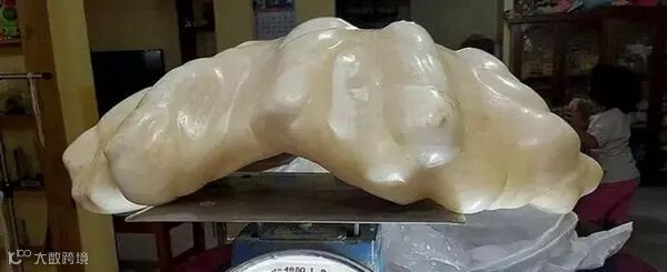 珍珠宽30厘米、长66厘米左右,此前世界上重6.5公斤、价值3500万美元的最大珍珠在其面前相形见绌。(图中为2.2英尺)
