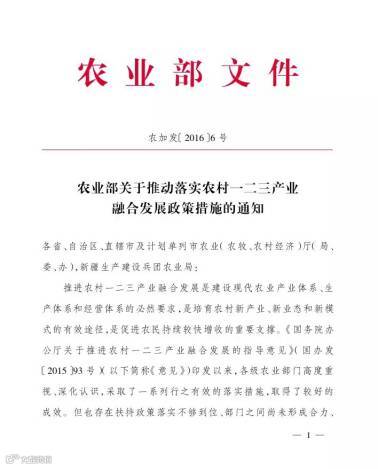 《农业部关于推动落实农村一二三产业融合发展政策措施的通知》