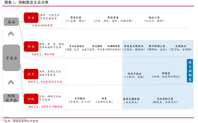 预制菜消费市场可分为 B 端(如酒店、连锁快餐、中小餐饮等)和 C 端市场(如商超、社区店、线上平台、家庭&个人消费者)。据亿欧数据统计,中国预制菜市场 B:C 端的份额占比是 8:2。
