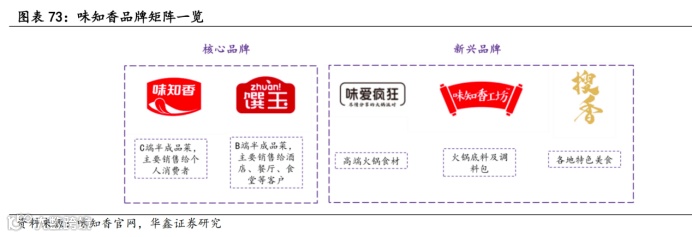 从C端来看,珍味小梅园签约知名演员王耀庆为品牌代言人;味知香公司建立了“味知香”和“馔玉”两大核心品牌,其中“味知香”品牌主要面向个人消费者,“馔玉”品牌主要销售给酒店、餐厅、食堂等客户。在深耕半成品菜产品的基础上,公司开发出“味爱疯狂”、“搜香寻味”和“味知香工坊”等新兴品牌,形成多元品牌矩阵。
