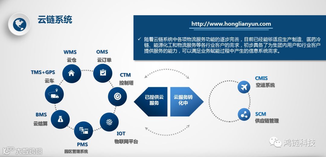 “云链智慧物流云平台” 基于供应链全局的物流管理和协作的云平台,深度集成了物联网软硬件、满足客户多种物流需求的一站式云平台。主要包含仓库管理系统(wms)、运输管理系统(TMS)、园区车辆预约系统(PMS)和物联网应用系统(包含RFID、GPS、电子锁门磁、智能操作、货物监控等) ,各个系统相互协调配合,为客户打造扁平快速化的供应链体系;为制造企业、货主和物流企业提供基于供应链的全链条管理的数字化和可视化服务,通过控制塔提高客户服务满意度。