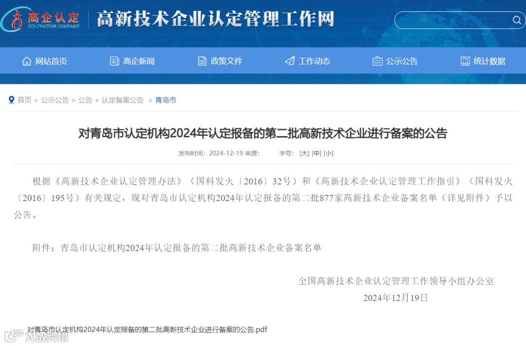 12月19日,高新技术企业认定管理工作网发布了《青岛市认定机构2024年认定报备的第二批高新技术企业备案名单》,山东港云数字科技有限公司(简称“港云数科”)荣获高新技术企业认定。