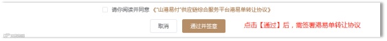 第二步:签署转让协议。点击【通过】后,阅读并同意《“山港易付”供应链综合服务平台港易单转让协议》,并点击【通过并签章】签署转让协议。