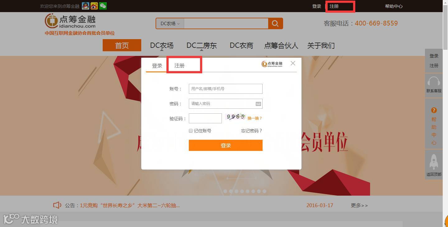 2、点筹金融微信公众号(dianchouwang)H5注册