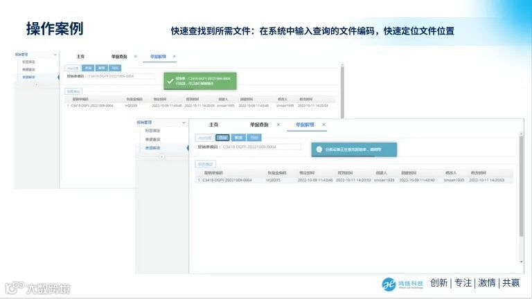 通过鸿链文件智能定位系统,深度集成rfid技术,规范文件管理,快速定位所需文件位置。使用系统前,寻找200个文件需要8小时完成;使用系统后,只需要半个小时完成。
