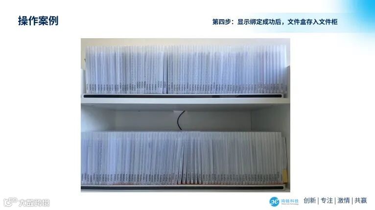鸿链科技文件智能定位系统通过RFID技术的巧妙应用,以极低的成本实现一键扫描,在2秒钟内从众多纸质单据中精准定位找到相关单据,极大提高单据的整理效率。以前需要两天整理的单证,现在半个小时即可完成。