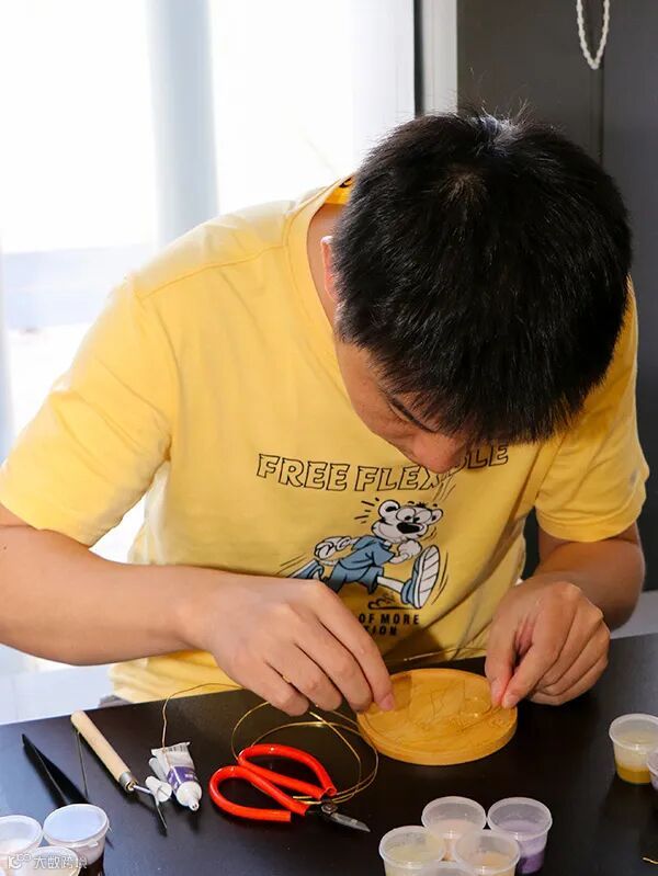 “铜丝要贴得齐,才能让后续的彩料不溢出。”“转弯的地方要慢慢调整角度,保持线条流畅。”讲师及时解答大家的疑问,纠正操作细节。