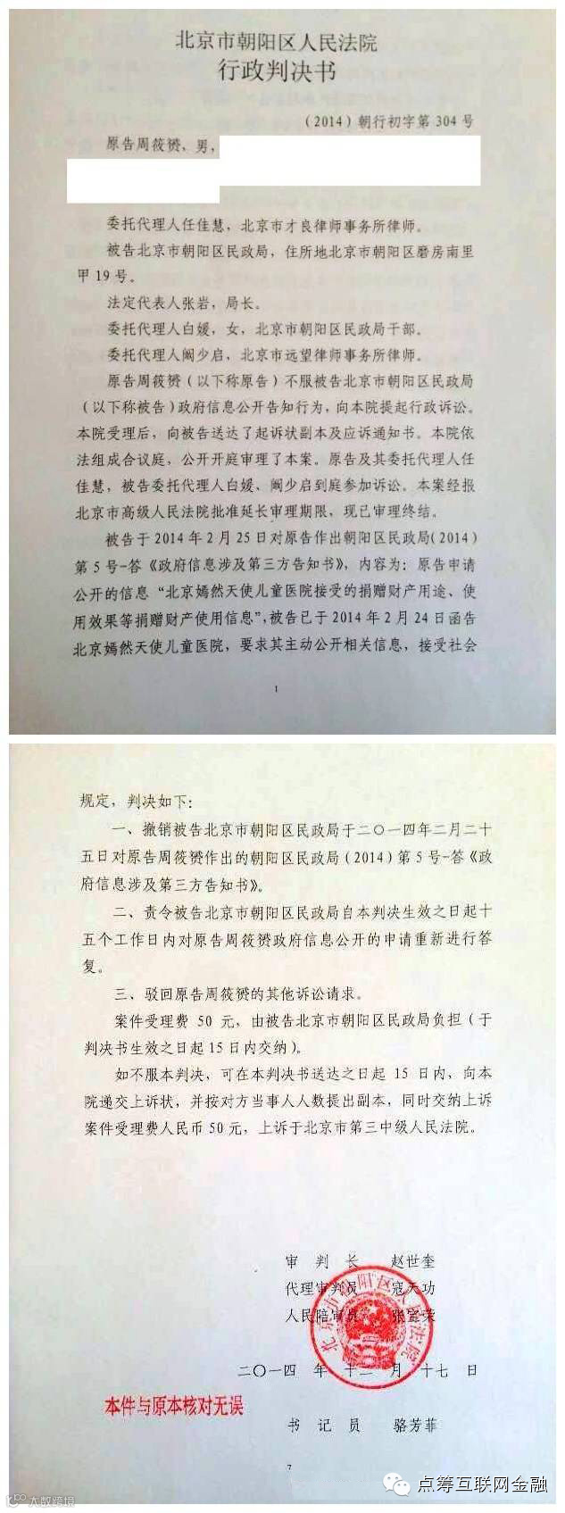上面的视频,是今年9月9日开庭的过程。经过漫长的等待,2014年12月17日下午14点,北京市朝阳区人民法院正式宣判,撤销此前朝阳区民政局(李亚鹏嫣然医院的登记管理机关)的拒绝公开答复,责令重新答复。我要求朝阳区民政局必须公开嫣然医院的财务数据!