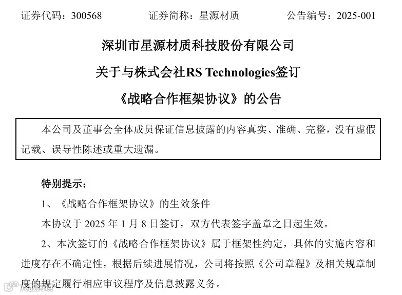 1月9日,星源材质发布公告称,随着半导体材料需求的大幅增长和新型半导体材料研发的加速,公司作为新能源材料行业的全球领军企业,为进一步发挥公司在材料领域研发、生产和销售的优势,与株式会社RS Technologies达成《战略合作框架协议》,建立长期战略合作关系,共同致力于半导体材料领域协同公关、科技成果转化、科技服务生态等方面的合作交流,推动双方互利共赢。