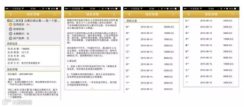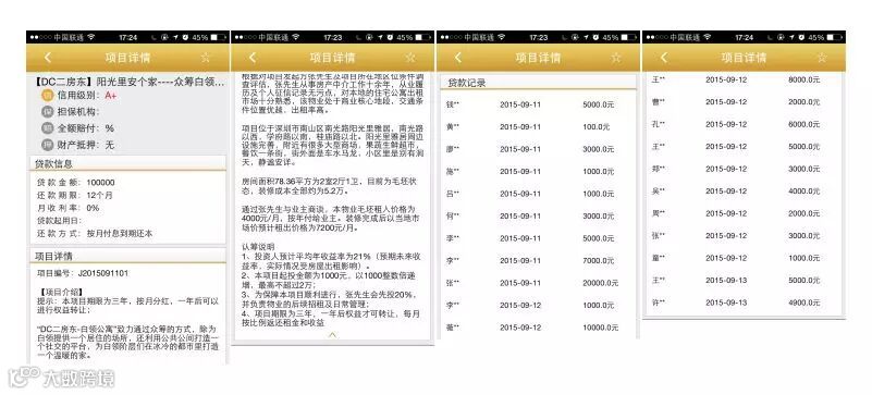 “阳光里安个家”以及“众筹白领公寓”项目也颇受投资人欢迎,其中“阳光里安个家”项目位于深圳南山区,投资人起投金额为1000元,以1000的整数倍进行投资,最高不超过2万元。预计年化收益率为21%左右。“众筹白领公寓”项目位于深圳南山区,投资人预计年化收益率为22.7%左右。
