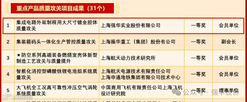 强华股份申报的“集成电路外延制程用大尺寸镀金腔体质量攻关”项目,荣获2024年上海市重点产品质量攻关一等奖。