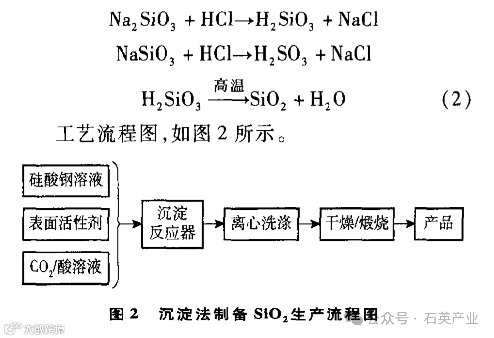 化学沉淀法是合成石英粉体较为广泛的方法之一,目前技术已经成熟,已用于工业化生产。沉淀法 生产Si02的原理:采用硅酸钠与二氧化碳或酸溶液 (加盐酸、硫酸或硝酸)作为原料,在一定的合成温 度和表面活性剂的作用下混合反应,得到偏硅酸沉 淀,再经过滤、洗涤、干燥、煅烧工序制备出Si02。