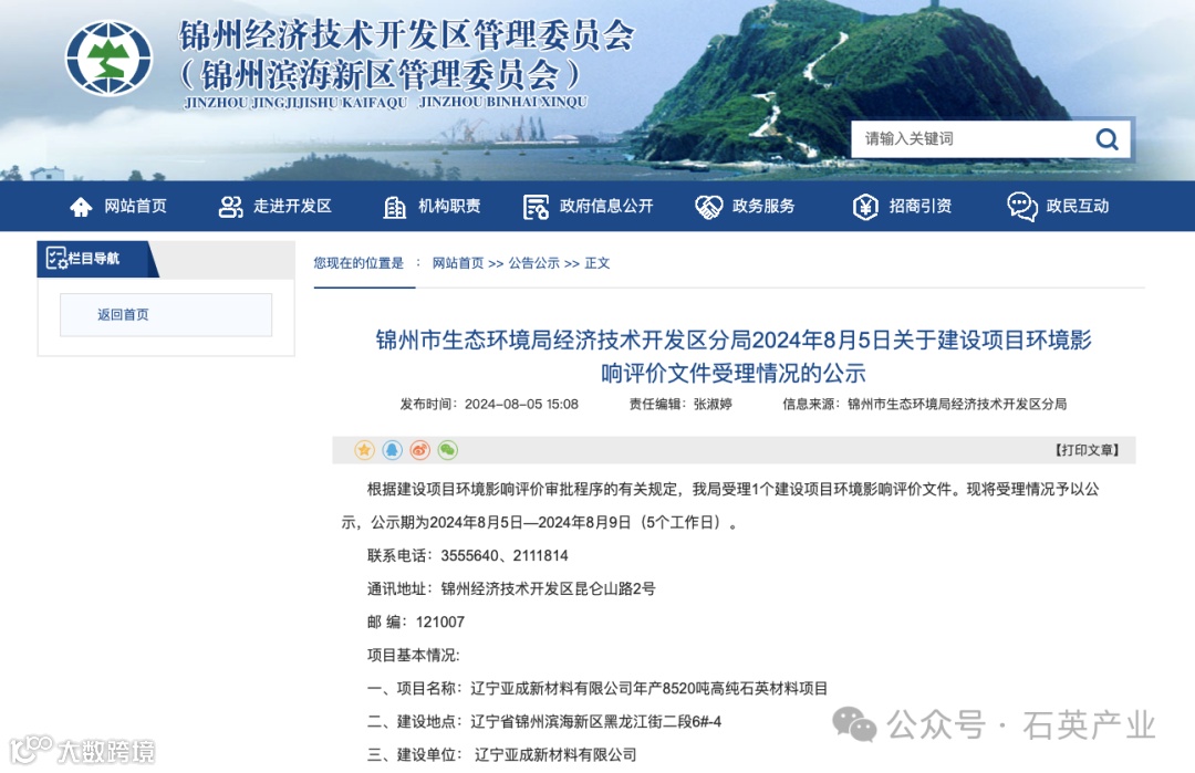 8月5日,北京亚泽石英材料有限公司和锦州市士成新材料有限公司共同投资的辽宁亚成新材料有限公司年产 8520 吨高纯石英材料项目环评报告表公示。