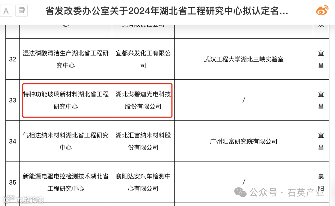 近日,湖北省发展和改革委员会公布了2024年48家湖北省工程研究中心认定名单。其中,湖北菲利华石英玻璃股份有限公司获批“先进石英玻璃材料湖北省工程研究中心”,湖北戈碧迦光电科技股份有限公司获批“特种功能玻璃新材料湖北省工程研究中心”。