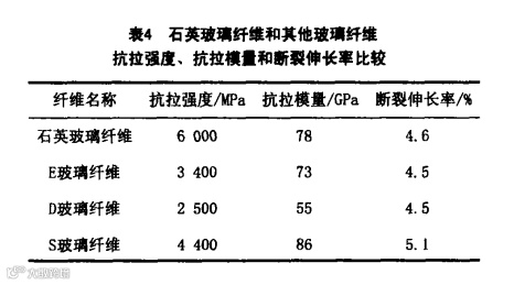 石英玻璃纤维的抗拉强度是普通玻璃纤维的3倍 ,它和玻璃纤维的抗拉强度 、 抗拉模量和断裂伸长率比较见表4。