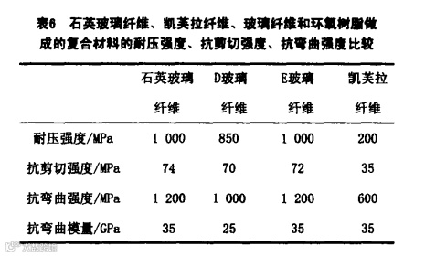 石英玻璃纤维 、凯芙拉纤维 、玻璃纤维和环氧树脂做成的复合材料的耐压强度 、抗剪切强度 、抗弯曲强度比较见表 6。