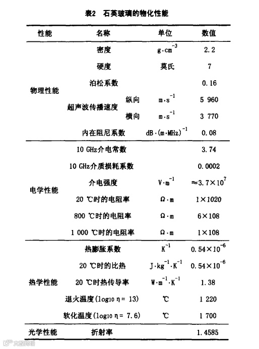 从表1 分析可以看出 ,石英玻璃纤维的成分基本上就是高纯石英玻璃的成分 , 其性能就非常接近石英玻璃的性能 ,石英玻璃的物化性能见表 2。