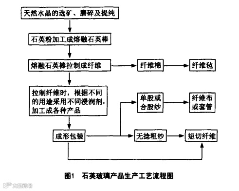 石英玻璃纤维一般是由纯的天然水晶提炼加工成熔融石英玻璃棒拉制而成 ,丝 的纯度为sio2>99.99% 。在拉制过程中,加热的方式有氢氧火焰法和等离子体法 ,根据用途的不同 ,涂覆相应的浸润剂 。石英玻璃纤维的产品有直接无捻粗纱 、有捻纱(包括单股和合股纱 )、 纤维布 、纤维套管 、短切纤维 、纤维棉 、纤维毡和纤维砖等。石英玻璃纤维各种产品的生产工艺流程如下: