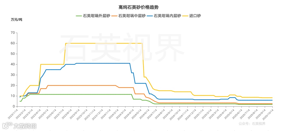 高纯石英砂(石英坩埚中层用)价格在2.5-3.0万元/吨,均价3.25万元/吨,较上周持平;