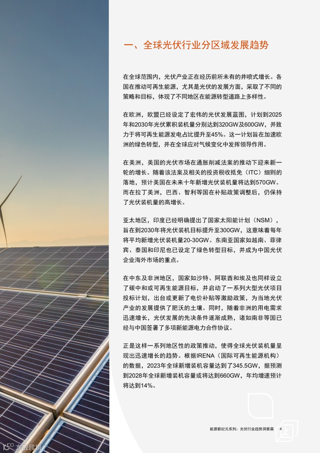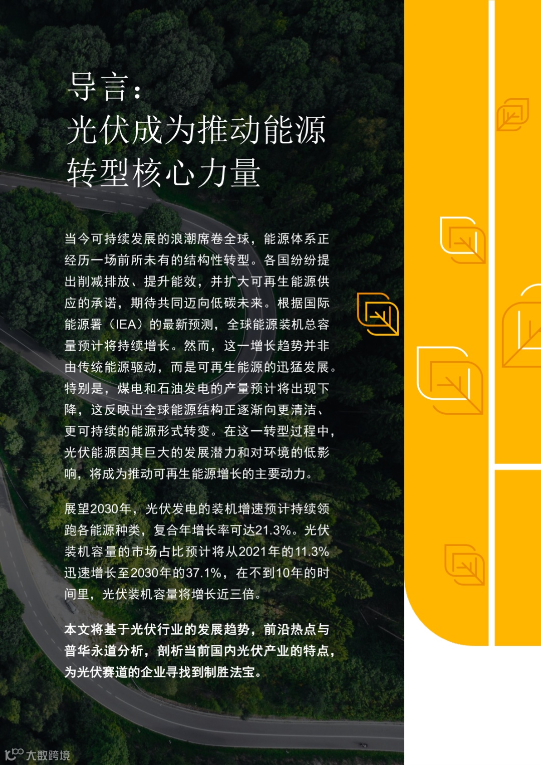 导读:导读:报告指出,在可持续发展的大背景下,全球能源结构正向更清洁、更可持续的能源形式转变,光伏能源因其低环境影响