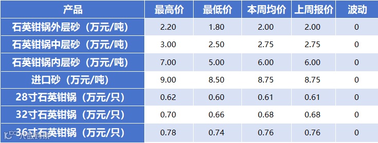 高纯石英砂(石英坩埚外层用)价格在1.8-2.2万元/吨,均价2.0万元/吨,较上周持平;