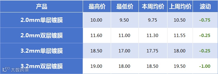 3.2mm双层镀膜价格在18.0-19.00元/平方米,均价18.50元/平方米,较上周下调1;