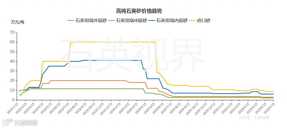 高纯石英砂(石英坩埚中层用)价格在3-4万元/吨,均价3.5万元/吨,较上周持平;