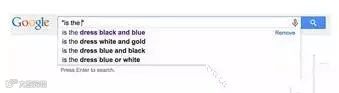 人们还纷纷到搜索引擎上去寻找答案,由于搜索的人太多,以至于在Google上只要输入"is the"这两个单词,就会直接提示"is the dress white and gold" 等相关搜索。