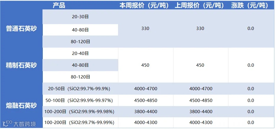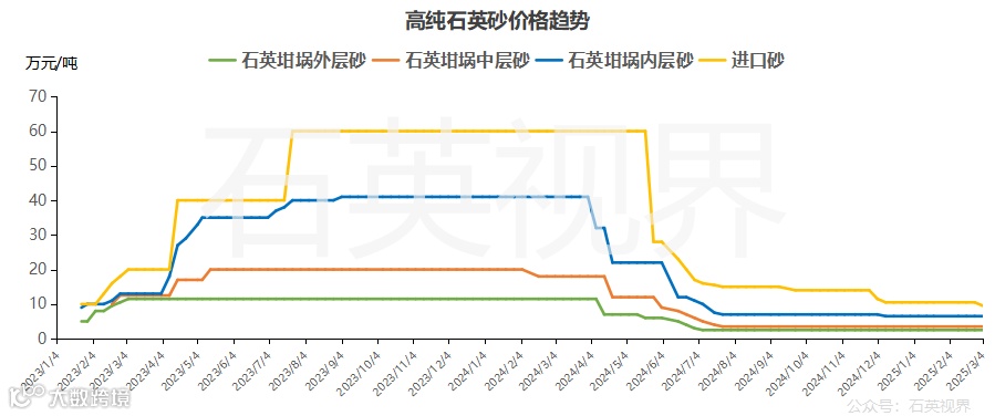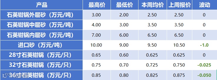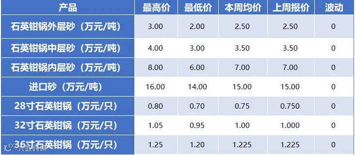高纯石英砂(石英坩埚中层用)价格在3-4万元/吨,均价3.5万元/吨,较上周持平;
