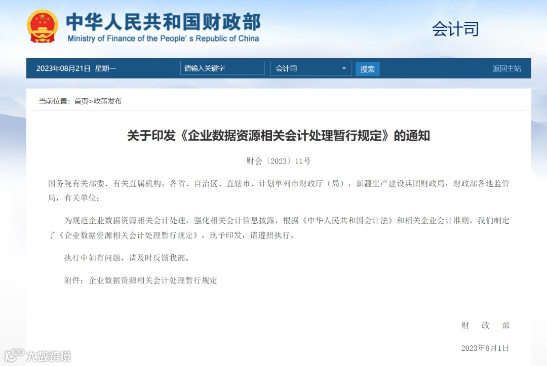 《企业数据资源相关会计处理的暂行规定》已发布并正式实施,规定中明确企业使用的数据资源符合条件的可以作为无形资产来确认,以对外交易为目的用于出售的数据资源可以作为存货来确认。