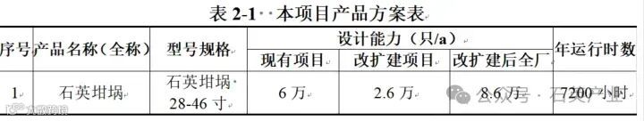 利用现有厂房,新增熔制炉、空压机、循环水塔及水处理设备等生产及辅助设备,新增石英砂纯化、喷钡等工艺,本改扩建项目新增年产光伏及半导体级大直径石英器材产能2.6万只。