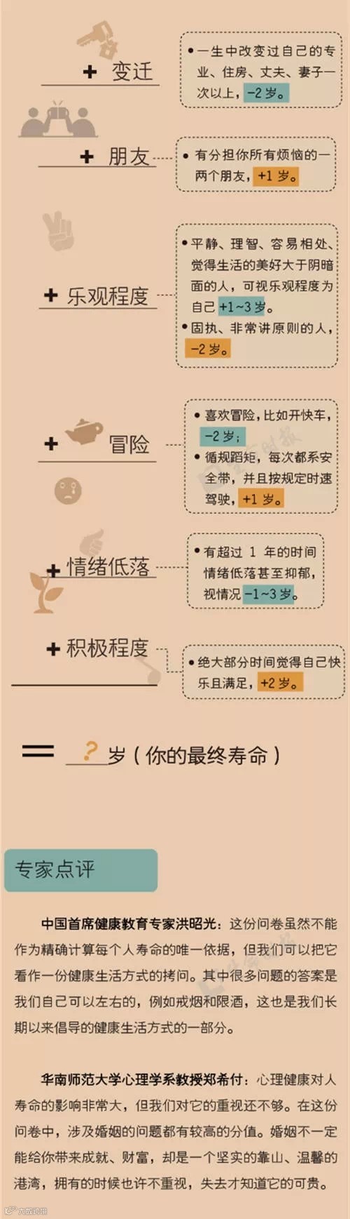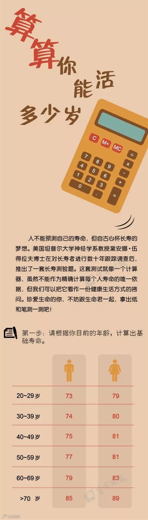 影响寿命长短的因素有很多,但这并不妨碍人们预测自己的寿命。美国坦普尔大学神经学系教授黛安娜•伍得拉夫博士在对长寿者进行数十年跟踪调查后,推出了一套长寿测验题。想长寿的你,赶紧准备好笔和纸,戳图算算吧~