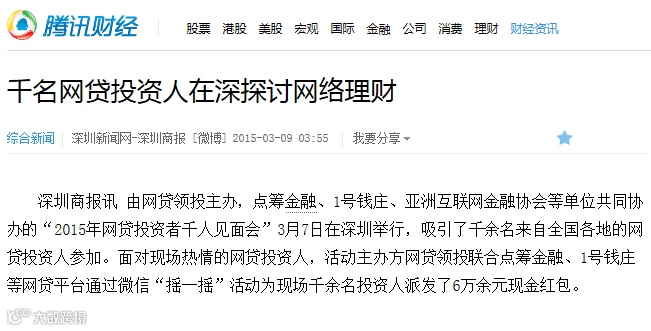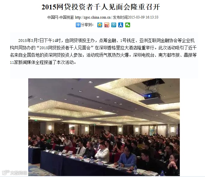 由网贷领投主办、点筹金融协办的“2015网贷投资者千人见面会—深圳站”于3月7日在深圳香格里拉大酒店圆满落下帷幕。来自全国各地的50家最具公信力网贷平台总裁及上千名网贷投资人参加了此次会议。深圳电视台、南方都市报、晶报等11家新闻媒体全程报道了本次活动。